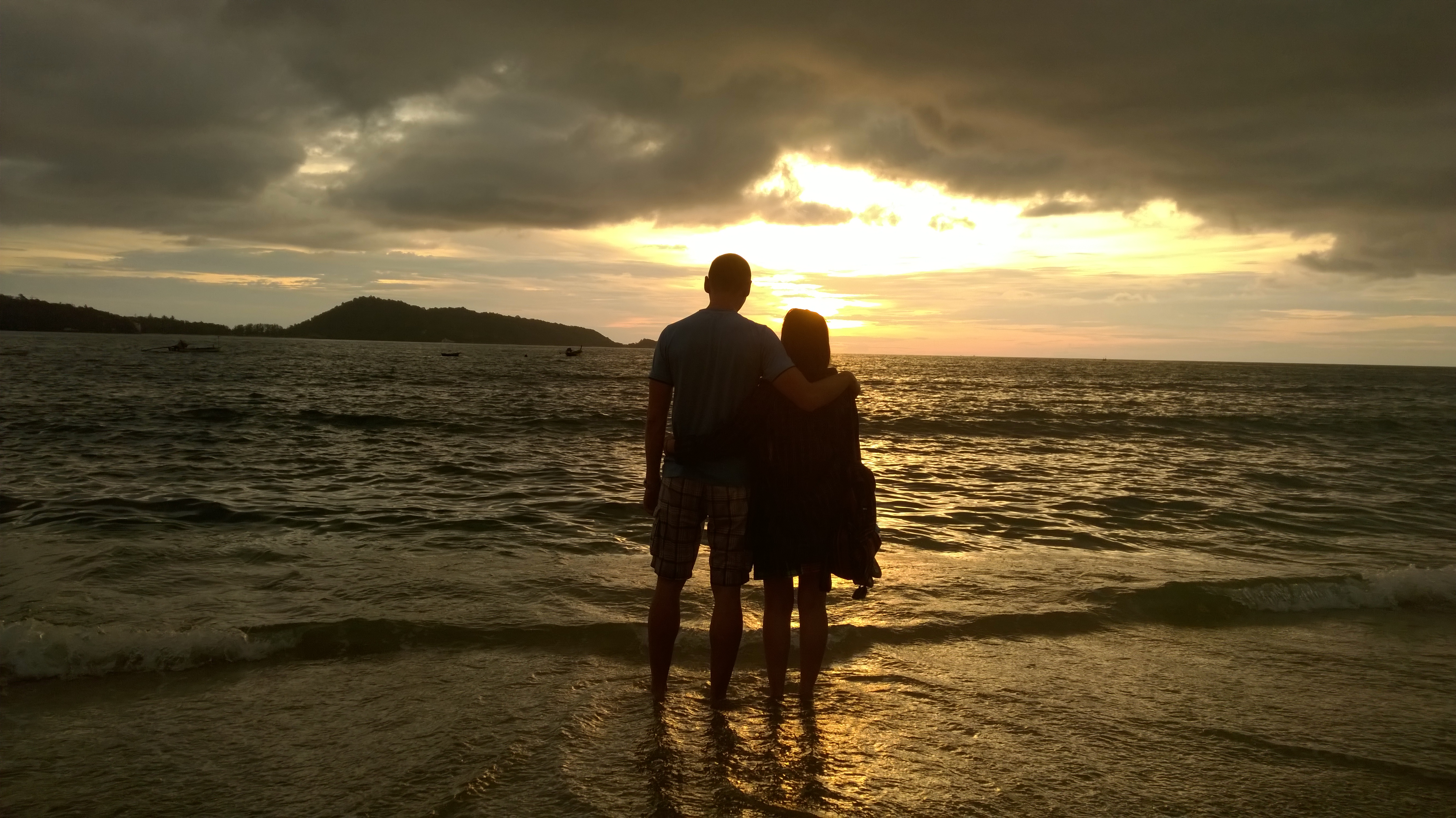 В первый день глазам немного сложно привыкнуть к окружающему миру и сконцентрироваться на чем-то конкретном. Сложно смотреть на дома, когда вокруг такая красота, пальмы, солнце и безгранично красивые виды. Мы посмотрели на множество вариантов, ознакомились с политикой цен, но нам ничего не приглянулось и с началом заката мы двинулись на пляж Патонг, чтобы увидеть море. Два дня на курорте, а моря еще видели... А вот мы на пляже, чистый песочек, волнующееся море и романтический закат…